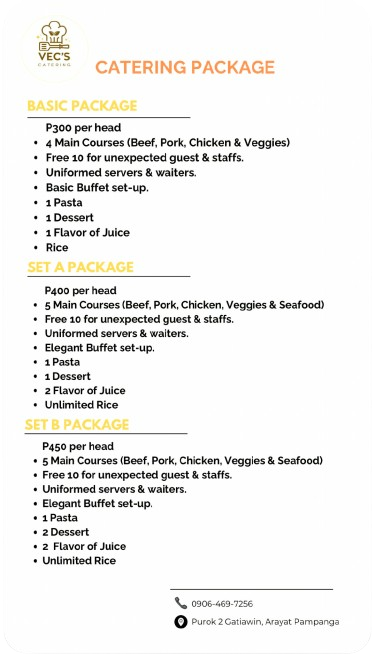 we also provide catering packages suited for different budgets, from basic to more premium options. each package includes a full meal, buffet setup, and professional service staff. higher packages come with more main dishes, extra desserts, more drink options, and a more elegant setup, perfect for creating a more refined and memorable event.